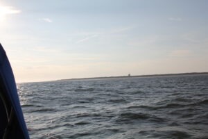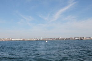 After waiting for the tide to rise sufficiently to lift the boats from the mud and to give enough clearance to get into the deeper water of the harbour we set of heading South, well SSE. What was imediately obvious was the coast had suddenly changed from high cliffs and hills to a very much lower lying landscape and sandy beaches.