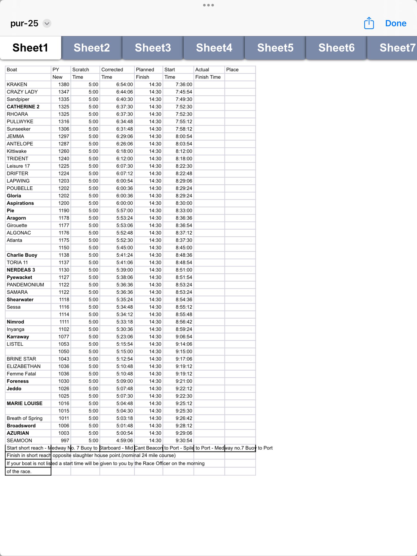 Please find the updated start times for the pursuit race, that includes some of the missing boats. The object is by using handicaps each boat has a different start time and in theory all should finish at the same time.