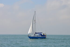 Had we kept to our original track everything would have gone so much better! The radio broadcast kept saying Yeddo, Yeddo, nobody took any notice until suddenly a different voice came over the radio saying Jeddo. Jeddo replied immediately with “station calling Jeddo, please say again.” The lady on the radio announced herself as “Firing Range” and Jeddo was in their live firing area, “immediately alter course to three zero zero degrees.” Jeddo was the only boat of the group with an AIS transponder, the rest of us were just blips (targets is probably the wrong term in this case) on the radar. A scramble below to the chart table to check. Not one chart on any of our boats had any firing range marked. We couldn’t reach Daydream as Nick had decided to go on the inside route, the remainder hot footed towards a marker buoy, from memory it looked very much like a Cardinal Mark. Just after passing the mark Ken attempted to contact the Firing range on CHL 67 where we had been communicating with them previously to check if we were now out of their range. There was no response from the range, but Dover Coast Guard picked up the call and questioned “which range are you calling?” Almost immediately the Belgium Coast Guard came on effectively telling them to butt out, the situation was under control and in their water. 20 minutes later we were thanked for our co-operation and informed all firing had ended for the day. Lethera made radio contact with Lou, ex Lower Halstow village Post Master, who was crewing on Jeddo and asked him if had any postage stamps, we could use to make temporary repairs to the holes we had in the Genoa, LOL. A detailed look at the Chart Plotter revealed a note mentioning the shooting range. Oostende Radio had a list as long as your arm from 298 down to 235, taking over an hour to get through, “bet it was there somewhere,” but none of us had heard any mention of a shooting range.
