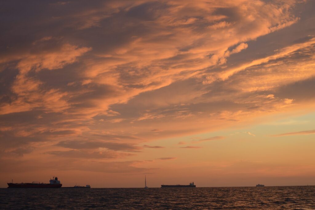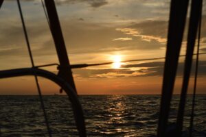 Converging onto West Hinder with barely 30 minutes between us, the light now beginning to fade, Lethera and Daydream crossed before the waypoint, followed by Jeddo and Tikki Bird. The NE breeze now had a crisp chill to it. We bore away on to an Easterly heading to navigate through the Oustendyke Anchorage. At least 16 anchored vessels in total, we picked the Southern end of the anchorage and cleared it line astern, mastheads visual.