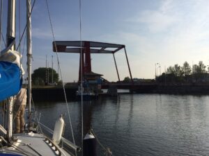 At 06.30, off the Breskins Cardinal mark we started our final leg into Vlissingen, another pizza was put in the oven, trouble was it got busy, turn to port, go about, slowdown, cargo boats, ferries, Pilot boats all contributed to prolonging the journey. Still by 08.00 we were through the lock and waiting on the pontoon for the first bridge lift at 08.37.